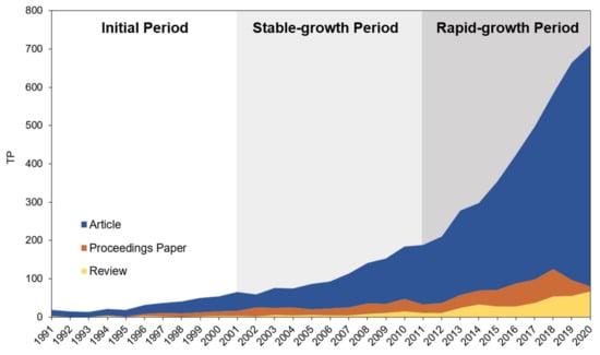 The number and trend of publications generally reflect the extent of attention to a field. Figure 2 presents the total number of publications (TP) on UFS each year from 1991 to 2020, and the study period can be classified into three subperiods: initial period (1991–2000), stable-growth period (2001–2010), and rapid-growth period (2011–2020). In the initial period, the number of publications was relatively small and grew slowly, totaling 268. In the second period, UFS began to receive widespread attention from scholars, showing a clear upward trend. Compared with the initial period, the second period increased by 255.6%, to 953. In the third period, particularly after 2014, the volume of publications increased significantly. The average annual volume of publications of the third period reached 414, and the total number was 4139, an increase of 334.3% compared with the second period. The volume of publications on UFS shows a trend of steady increase every year.