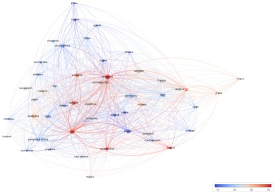 Some of these papers are cooperative endeavors across countries. Co-occurrence analysis of the top 50 countries/regions (number of publications) is used for evaluating the collaboration between countries (only articles published in collaboration are included). In Figure 3, the circle size represents the number of partner countries; the color value represents the average number of citations per publication; the thickness of the line segment represents the degree of direct cooperation between two countries/regions. The USA, Germany, the UK, Canada, and China have participated in more international collaborations. Each of these countries/regions has cooperated with 49, 49, 47, 46, and 45 of the other 49 countries/regions, respectively. As a result, the USA plays the most essential part in the field of UFS, as it has the most collaborative publications with international partners, for a total of 1250 publications with the other 49 countries. Furthermore, it has more cooperation with the UK and China than with any other countries. As a country becomes more important on the global stage, it will tend to engage in more academic cooperation with other countries/regions.