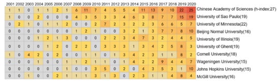 Figure 4 shows the top 20 most productive institutions. Among the 5390 institutions involved in UFS research, only 26 (0.46% of total) institutions published more than 30 papers. The USA has the largest share of the selected institutions, with 11, followed by China with four. The Chinese Academy of Sciences published the most papers (139), far beyond that of any other institution, and its volume of publications has increased significantly in recent years. This is followed by the University of Sao Paulo (90), the University of Minnesota (52), Beijing Normal University (45), and the University of Illinois (43). The h-index results show that the Chinese Academy of Sciences (27), the University of Minnesota (22), Harvard University (20), and the Universities of Ghent, of Sao Paulo and of Illinois (all 19) are the most influential academic institutions. Furthermore, the 100 institutions with the largest volume of publications were selected for collaborative analysis (Figure 5). Among these institutions, the University of Oxford, University of Minnesota, University of Copenhagen, Chinese Academy of Sciences, and University of Sao Paulo are the most collaborative. Each of these institutions has cooperated with 35, 31, 28, 26, and 25 of the other 99 institutions, respectively.