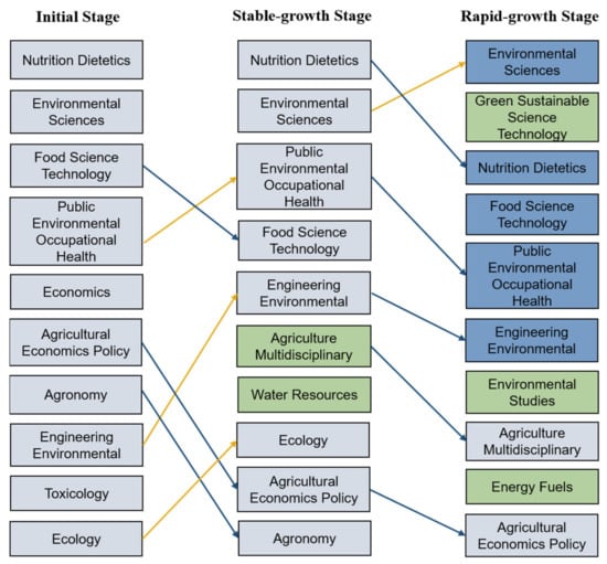 According to WoS’s classification for subjects, there is a total of 252 subject categories. UFS research has been associated with about 187 subject categories between 1991 and 2020, indicating that UFS includes a wide range of research areas. In the initial period, there were 89 subject categories related to UFS, with nutrition dietetics (64 publications), environmental sciences (47), and food science technology (42) being the categories with the largest numbers of publications. During the second period, the number of research categories increased to 138, and nutrition dietetics (191) still ranked first. Multidisciplinary agriculture and water resources, which did not appear in rankings in the first period, were added to the top 10. The rankings of public environmental occupational health, environmental engineering, and ecology also rose. In the third period, environmental sciences (1356) ranked the highest and has occupied a large proportion, 32.6%. Green sustainable science technology, which even did not appear in the first and second period lists, ranked second (598). In addition, environmental studies and energy fuels were added to the rankings. Figure 6 shows the changes in the structure of the research categories. It can be seen that research on environmental fields is getting more attention. Researchers are also concerned about diet and nutrition. Whereas, the research related to agriculture were relatively reduced, such as agronomy and agriculture multidisciplinary.