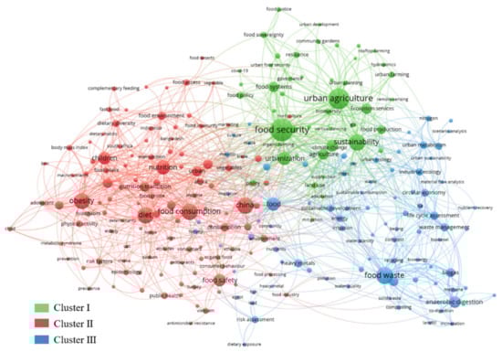 There are 11,776 keywords in the selected publications. In total, 35 keywords appeared only once during the first period; hence we did not list these (Table 3). The number of keywords has increased significantly over time, with the third period having about 7441 more keywords than the second period. For instance, only 17 papers covered ‘urban agriculture’ in the second period; occurrences of this phrase increased to 208 in the third period, ranking second. The third-ranking keyword in the third period was food waste (146), which did not appear during the second period. Sustainability, notably, has always appeared on the list of high-frequency use. Remarkably, China ranked in the top five in the frequency of keyword occurrences during the second and third periods. As for changes in the frequency of keywords in the second and third periods, food security (37 occurrences in the stable-growth period, and 201 occurrences in the rapid-growth period) is the most crucial topic in UFS research—not surprisingly, as food is one of the most basic human needs [36]. The rapid development of urbanization has further aggravated the shortage of agricultural land; therefore, ensuring food security in the face of rapid urbanization is an urgent problem that must be explored and solved [14,37]. The second period was more inclined to consumer-related topics, such as food consumption, diet, and obesity issues, while in the third period, there was more research on food production and food waste. Population growth and the reduction of arable land have prompted research on producing food more efficiently [38,39,40], and food waste permeates the entire food supply chain and has adverse effects on resources, the environment, and society [41].