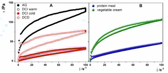 (A) Flow curves of AG (full black circles), DCI hydrated with warm water (open black circles), DCI hydrated with cold water (full red circles), DCD (open red circles), (B) flow curves of Protein Meal (full blue circles) and Vegetable Cream (full green circles).