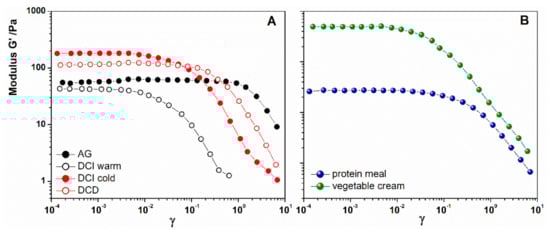 Considering the new formulations, in Figure 3B, PM exhibited a lower strength than the VC but a longer LVE. The vegetable cream, on the other hand, had higher rigidity (G’) because it contained a higher thickener concentration [17,19].