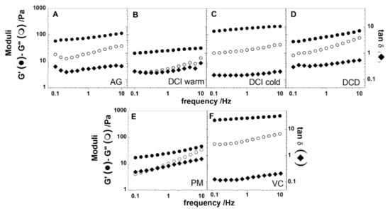The results of the oscillation tests provided significant evidence on the sample structure. Strain sweep tests (Figure 3) together with frequency sweep tests (Figure 4) revealed the gel-like behavior for all the samples that were characterized by the elastic modulus G’ higher than the viscous modulus G”. The linear viscoelastic (LVE) region for each sample was identified in Figure 3 as the region where G’ was independent of the applied deformation. It can be noted (Figure 3A) that the AG sample showed a longer range of linearity compared to the others. A slightly shorter linear region than AG was detectible for DCD, and higher deformation dependence (smaller LVE) was registered for DCI, in particular if hydrated with warm water.