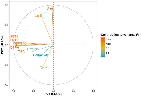 In Figure 1, variables with little contribution to extracts distinction will appear closer to the plot origin, whereas variables with greater contribution will be further from the center of the plot. From this, the variables with the highest contribution to extracts differentiation are those associated with antioxidant activity (ABTS: 13.42%; DPPH: 12.95%; FRAP: 12.86%), TFC (12.20%), TPC (11.98%), and photosynthetic pigments (chlorophyll-a and -b, 13.09% and 9.90%, respectively). The variables with lower contribution were extraction yield, total protein content, and carbohydrate content (6.36%, 4.14% and 3.10%, respectively). These results reveal that extraction yield, total protein content, and carbohydrate content were fairly similar across the samples produced, but divergencies were mainly found in terms of phenolic contents, photosynthetic pigments, and antioxidant activities.