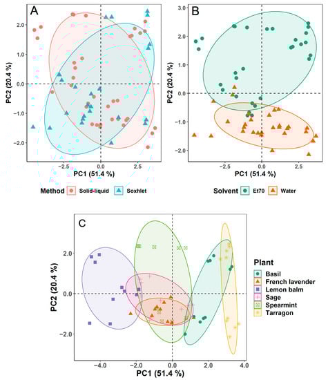 Score plots of the first two components of the PCA were also produced to display the grouping of plant extracts by extraction method, solvent, and plant type, as shown in Figure 2A–C, respectively.