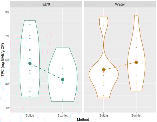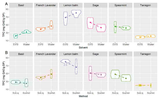 In Figure 3A, each violin plot displays the distribution of TPC values obtained from both extraction methods, for each solvent and plant combination tested. Similarly, in Figure 3B, each violin plot displays the distribution of TPC values obtained from both solvents, for each extraction method and plant combination tested. The height of the violin plot indicates the distribution of the values obtained, while the varying width indicates the frequency of data points in each region.