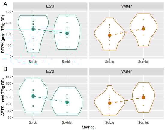 Despite the nonsignificant main effects “method” and “solvent” on the results of the DPPH and ABTS assays, the significance of the “method × solvent” term in both cases (p < 0.001) reveals the existence of an interaction between these variables that affects the outcomes of such assays. These interactions on the outcomes of the DPPH and ABTS assays are shown by the distinct slopes of the dashed lines in Figure 4A,B, respectively).