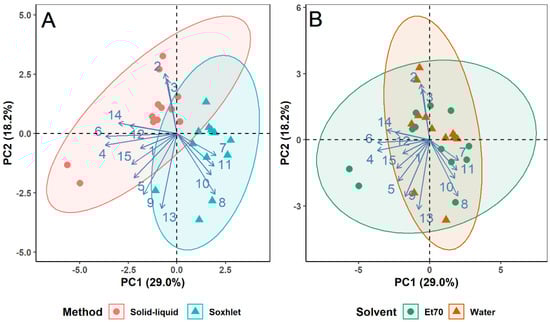 Score plots of the first two components of the principal component analysis (PCA) of phenolic compounds grouped by extraction method (A) and solvent (B). Phenolic compounds: 1–Chlorogenic acid, 2-Vanillic acid, 3-Syringic acid, 4-Cinnamic acid, 5-p-coumaric acid + epicatechin, 6-o-coumaric acid, 7-Rosmarinic acid, 8-Ellagic acid, 9–Naringin, 10–Hesperidin, 11–Kaempferol, 12–Resveratrol, 13-Ferulic acid, 14–Quercetin, 15-3,4-Dihydroxybenzoic acid.