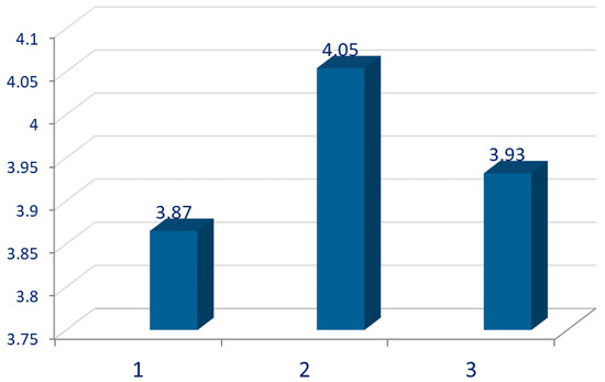 Consumer’s average sensory score of evaluated cheeses (p = 0.10) using a scale of 1 to 5 (1 = unacceptable and 5 = very acceptable). 1—without milk standardization; 2—standardization casein/fat = 0.7 by addition of skimmed milk powder; 3—standardization casein/fat = 0.7 by skimming part of the milk fat.
