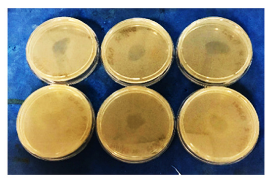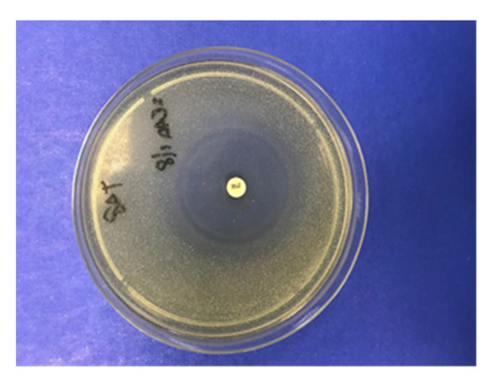 The RAC was assessed on three PAPs, chosen because of their TCLs concentrations were found to be higher than 25 µg kg−1 for at least three TCLs in PAPs by LC-MS/MS. A blank PAP sample was used as negative control. Acidic digestion conditions occurring in the stomach were simulated as described by Kühne et al. (2001) [21] using 12.5 g of PAP. Then, 100 µL of the digested PAPs were placed on Test Agar pH 8 plate (Biotech, Grosseto, Italy) containing spore suspension of Bacillus subtilis BGA (Merck KGaA, Darmstadt, Germany) and incubated aerobically overnight at 37 °C. The tests were considered as positive when a ring area without bacterial growth around the inoculum was observed, as occurred in positive controls, as shown in Figure 1.