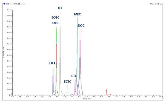 In EU, the use of tetracyclines (TCLs) in food producing animals is permitted with maximum residue limits (MRLs) ranging from 100 to 600 µg kg−1, depending on target tissues, according to Regulation (EC) 37/2010 [15]. TCLs are a family of broad-spectrum agents highly effective against Gram-positive and Gram-negative bacteria, Chlamydia, mycoplasmas, Rickettsiae, and protozoan parasites [16,17]. Moreover, they are well absorbed, low toxic, and relatively inexpensive [16].