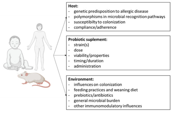 - Spacova, I.; Ceuppens, J.L.; Seys, S.F.; Petrova, M.I.; Lebeer, S. Probiotics against airway allergy: Host factors to consider. Dis. Models Mech. 2018, 11. [Google Scholar] [CrossRef]