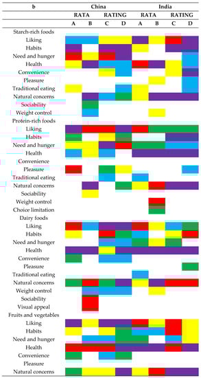 (a) Rank of the top five motivation constructs based on percentages of “apply” responses for RATA (A) and RATING (C) survey formats within each food group for Brazil, Spain, and the USA. Additionally, the top five motivation constructs based on mean scores per country for RATA (B) and RATING (D) within each food group for Brazil, Spain, and the USA are included. Rank color codes for the top five motivation constructs: purple = first position, red = second position, yellow = third position, green = fourth position, and blue = fifth position. (b) Rank of the top five motivation constructs based on percentages of “apply” responses for RATA (A) and RATING (C) survey formats within each food group for China and India. Additionally, the top five motivation constructs based on mean scores per country for RATA (B) and RATING (D) within each food group for China and India are included. Rank color codes for the top five motivation constructs: purple = first position, red = second position, yellow = third position, green = fourth position, and blue = fifth position.