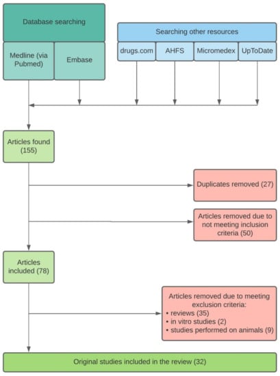 Initially, 155 articles were tracked. After removing 27 duplicates and performing the first evaluation, 78 articles reporting or investigating the effect of meals, beverages, dietary supplements, and dosing regimen on pharmacokinetics and pharmacodynamics of drugs used in oral osteoporosis treatment were considered to be included. No restrictions for study design, participants’ characteristics, or sample size were made. 35 reviews, two in vitro studies, and nine studies performed on animals were subsequently excluded. Finally, 32 original studies remained included and are discussed in this review. A flowchart of the searching strategy is presented in Figure 1.