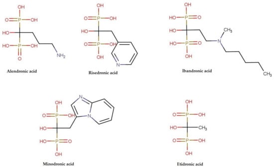 All bisphosphonates are the analogs of pyrophosphate, containing two phosphate groups linked by carbon atom (P-C-P), instead of an oxygen atom [17]. Additionally, as presented in Figure 2, each bisphosphonate has two side chains bound to the central carbon atom.