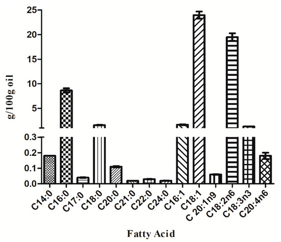 Total flavonoid contents (TFC) were estimated using the aluminum chloride method based on the antioxidant extract from oil, as described by Velásquez et al. (2019) [31]. Quercetin (Q) was used as the standard, and results are expressed in mg QE (100 g)−1 of seed oil. Some specific phenolic acids and flavonoids, such as 4-hydroxy benzoic acid, apigenin, caffeic acid, catechin, chlorogenic acid, cinnamic acid, chrysin, coumaric acid, epigenin, ferulic acid, gallic acid, kaempferol, luteolin, pinocembrin, quercetin, resveratrol, rutin, sinapic acid, syringic acid, vanillic acid, and phytohormone abscisic acid were quantified through using ultra-performance liquid chromatography (UPLC)-tandem mass spectrometry (MS/MS), according to the method described by Giordano et al. (2019) [32], by interpolation from standard calibration curves.