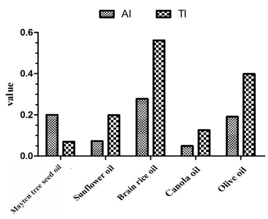 Atherogenic index (AI) and thrombogenic index (TI) values among Mayten tree seed oil and other commonly consumed seed oils (adapted from ref. [50]).
