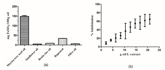 (a) Ferric reducing antioxidant power (FRAP) values for Mayten tree seed oil, sunflower oil, brain rice oil, canola oil, and olive oil. (Adapted with permission from Szydłowska-Czerniak, A. et al. [67], Copyright 2008 Elsevier); (b) Inhibition of the 2,2-diphenyl-1-picrylhydrazyl (DPPH) radical by Mayten tree seed oil. Values are represent as mean ± standard deviation.