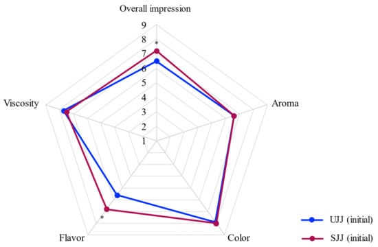Average scores of descriptive sensory analysis of steam extracted jaboticaba juices. UJJ = unsweetened jaboticaba juice; SJJ = sweetened jaboticaba juice. Asterisks indicate means significantly different (Wilcoxon paired test; p < 0.05). Nine-point scale: 1 = dislike extremely; 2 = dislike very much; 3 = dislike moderately; 4 = dislike slightly; 5 = neither like nor dislike; 6 = like slightly; 7 = like moderately; 8 = like very much; 9 = like extremely.