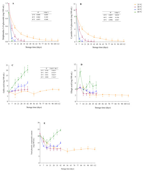 Contents of delphinidin-3-O-glucoside (D3G) (A), cyanidin-3-O-glucoside (C3G) (B), gallic acid (C), ellagic acid (D) and total phenolic compounds (E) of unsweetened jaboticaba juice during storage. First-order degradation kinetics parameters of D3G (A) and C3G (B) and zero-order formation kinetics parameters of gallic acid (C) are shown in the inserted tables. Asterisks indicate means significantly different from day zero for each temperature (One-way ANOVA followed by Dunnett’s post hoc test; p < 0.05).