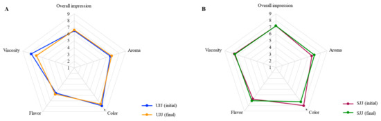 Average scores of descriptive sensory analysis of unsweetened (A) and sweetened (B) jaboticaba juices, UJJ and SJJ, respectively. Asterisks indicate means significantly different (Mann–Whitney unpaired test; p < 0.05). Nine-point scale: 1 = dislike extremely; 2 = dislike very much; 3 = dislike moderately; 4 = dislike slightly; 5 = neither like nor dislike; 6 = like slightly; 7 = like moderately; 8 = like very much; 9 = like extremely.