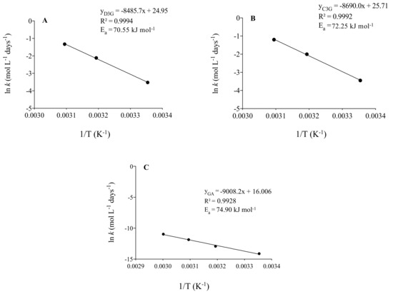 Arrhenius plots of delphinidin-3-O-glucoside (D3G) (A) and cyanidin-3-O-glucoside (C3G) (B) degradation and of gallic acid (C) formation.