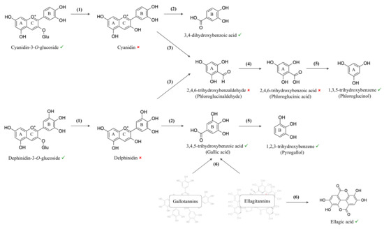 Proposed reaction pathways of phenolic compounds from jaboticaba juice during storage. Anthocyanins may undergo deglycosilation (reaction 1), followed by ring cleavage (reactions 2 and 3), oxidation (reaction 4) and decarboxylation (reaction 5), while tannins may undergo hydrolysis/depolymerization (reaction 6). Compounds marked with ✓ and 🗶 were observed and not observed in the juice, respectively.