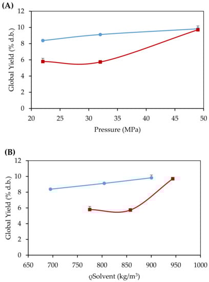 Global yield isotherms of extracts of B. crassifolia pulp obtained by CO2-SFE and CO2+EtOH-SFE at 343.15 K can be seen in Figure 1. The global yields of CO2-SFE ranged from 8.38% d.b. ± 0.13% d.b. (22 MPa-695 kg/m3) to 9.83% d.b. ± 0.36% d.b. (49 MPa-900 kg/m3). It can be seen that the increase in pressure and solvent density also increased the extraction yields. According to Silva et al. [], pressure variations in isothermal conditions define the performance of an SFE system, since this parameter has a great influence on fluid hydrodynamics, solubility, and mass transfer. In the study by Pires et al. [], for 323.15 K and 333.15 K isotherms of CO2-SFE of murici pulp, such behavior was also observed. When comparing the influence of temperature on this response obtained in both studies, it can be observed that global yields also increased with increasing temperature. This can be attributed to the increase in the solvation power of the solvents in the most drastic extraction conditions, which allowed a greater solubilization of the murici pulp compounds []. This behavior has also been observed by other authors [].