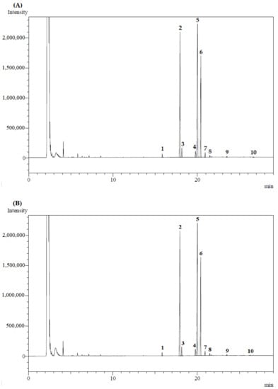 About these compounds contained in murici pulp, some studies have evaluated their phytochemical profile. In the carotenoid class, Rodrigues et al. [] identified as major carotenoids (all-E)-lutein, (all-E)-zeaxanthin, and (all-E)-lutein-3-O-myristate coeluted with (all-E)-β-carotene, where the free and esterified lutein corresponded to 48% total carotenoid content. In the study by Irías-Mata et al. [], the main carotenoids were (all-E)-lutein, (all-E)-zeaxanthin, and (all-E)-β-carotene, where (all-E)-lutein contributed 80–89% of total carotenoids. In the study carried out by Mariutti et al. [], the majorities were (all-E)-lutein and (all-E)-zeaxanthin, where lutein represented about 67.39% of total carotenoids.