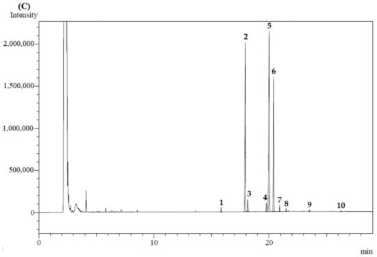 Total ion chromatogram of oils of murici pulp extracts (B. crassifolia) obtained by CO2-SFE, at 343.15 K and 22 MPa (A), 32 MPa (B), and 49 MPa (C), with the peak numbers corresponding to the compounds identification cited in Table 2.