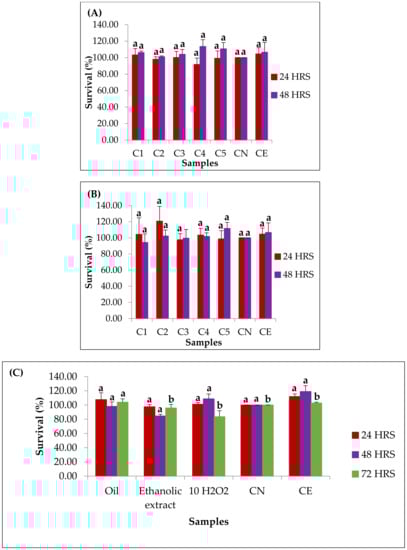 Cytotoxicity data of oil (A) and ethanolic extract (B) of murici pulp (B. crassifolia) obtained by CO2-SFE and CO2+EtOH-SFE, together with cytoprotection data using 0.05 kg/m3 of samples in HepG2 cells treated with H2O2 (C). * Different letters for the same incubation time showed a difference in significance level of 5% (p < 0.05) (ANOVA; Tukey test for multiple comparisons); C1: concentration 0.20 kg/m3; C2: concentration 0.10 kg/m3; C3: concentration 0.05 kg/m3; C4: concentration 0.025 kg/m3; C5: concentration 0.01 kg/m3; CN: negative control; CE: ethanol control; 10 H2O2: peroxide control.