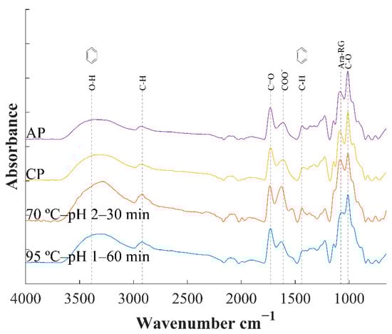 The FTIR spectrum of reference pectins (AP and CP) and two exemplary samples extracts at mild and harsh extraction conditions are presented in Figure 1. The band at 3289 cm−1 is mainly ascribed to the hydroxyl groups stretching of water molecules (O-H) in pectin [], while the vibrational bands in the range 2850–2919 cm−1 can be attributed to the C–H of CH, CH2 and CH3 groups (Pasandide et al., 2017). The band at 1746 cm−1 is associated with the vibration of the esterified carbonyl group C=O and the band at 1625 cm−1 to the free carboxylic groups COO-, with another one at the weaker symmetric vibrating at 1428 cm−1 []. Both peaks are widely used with regards to the evaluation of the degree of esterification in pectins, which can be estimated as the ratio between the peak area of the band corresponding to the carboxylate esterified group and the sum of both mentioned bands, among other calculation methods [,]. However, for the present samples, peaks related to protein were identified by the weak amide II band at ~1526 cm−1 []. Moreover, the broad band centred around 3300 cm−1 also contains contributions from the amide N-H stretching (3540–3125 cm−1), which causes a sharpening of this band and further evidences the presence of proteins in the extracts. This causes the vibration band of amide I (~1655 cm−1) to overlap with the bands of interest for DE calculation, and the estimation was not viable []. A greater protein content is observed at mild extraction conditions compared to harsher conditions giving higher yields or to commercial pectins (CP, AP; Figure 1). Protein content from WRP extracted under optimum conditions to maximize yield (OP; Section 3.7) was indeed much higher compared to reference CP and AP pectin (8.9, 2.2 and 1.7% d.w., respectively). This points towards probable protein interaction with AG side chains in the highly branched structures, as suggested previously []. Although these findings could imply a lower purity of pectin for conventional uses, the presence of small amounts of protein may promote the formation of pectin complexes with interesting emulsifying properties [,]. Although further purification treatments to remove proteins is an option, the presence of protein could constitute a valuable factor for WRP extracts with higher versatility for diverse applications. The two strong absorption bands at 1006 and 1079 cm−1 are attributed to the glycosidic linkage (C-O and C-C stretching bond) and is typical for backbone vibrations of pectin [,]. The band at 1077 cm−1 can be attributed to neutral Ara-based glycans or RG regions (Kacuráková et al., 2000) and is especially patent noted at less severe (Figure 1) extraction conditions, in agreement with compositional data (Table 4) and RS values (Table S2 in Supplementary Materials).