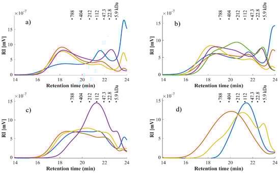 Molar mass (MM) distribution of the pectin extractions from WR studied. (a) 70 °C treatment runs: 6 (