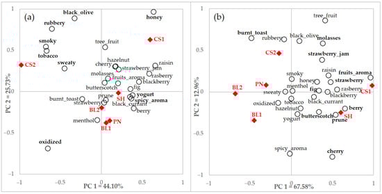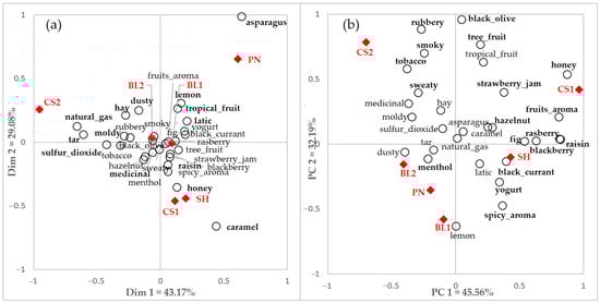 Figure 2 represents the CA and PCA biplots using CATA and rating data of total consumer responses using significant terms for CATA and rating, respectively. Samples were discriminated effectively by their sensory attributes, but some similarities and dissimilarities were observed. The X-axis of these two biplots showed similar descriptions of the properties. Fruit or sweet related attributes such as caramel, honey, and raisin were positioned on the right side of the X-axis, and some characteristics regarded as negative wine attributes such as dusty, natural gas, and tar were located on the left side. However, the sensory characteristics appeared more spread on the PCA plot than the CA plot.
