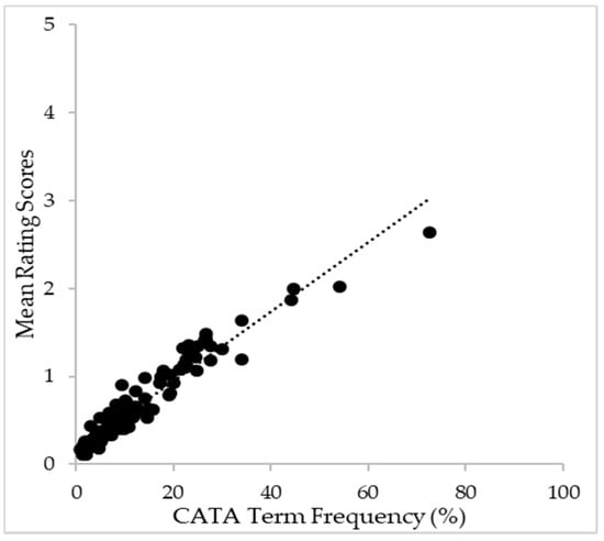 To address the relationship between the CATA citation frequency and the rated intensity of attributes [57], linear regression analysis was conducted [45,54]. Figure 3 shows that consumer results indicate a strong relationship between CATA and rating for red wine perception. Plots indicate that as the use of the CATA term frequency increases, the rating score also increases linearly with the linear index R2 = 0.929.