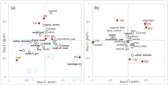 Figure 4. Correspondence analysis (CA) of (a) users and (b) non-users data with integrated significant terms (n = 18) by CATA questionnaire of total consumers, users, and non-users. Filled diamonds indicate red wine samples and empty circles indicate attributes. Terms in bold indicate significant differences according to each consumer group with different familiarity.
