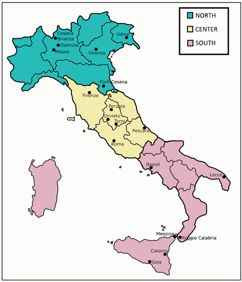 Collection sites of the sushi survey in Northern (green), Central (light yellow) and Southern (pink) Italy.
