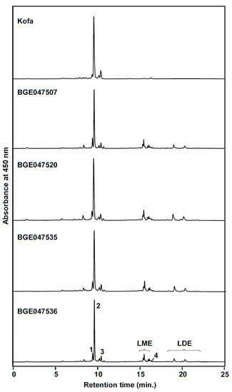 HPLC chromatograms corresponding to the grain carotenoid profile of the durum wheat accessions BGE047507, BGE047520, BGE047535 and BGE047536 presenting carotenoid esters. Cultivar Kofa is included as a zero-ester control. Peak identities: 1, (all-E)-zeaxanthin; 2, (all-E)-lutein; 3, (Z)-lutein isomers ((9-Z)-lutein and (13-Z)-lutein); 4, (all-E)-β-carotene; LME, lutein monoesters; LDE, lutein diesters. Detection wavelength was 450 nm.