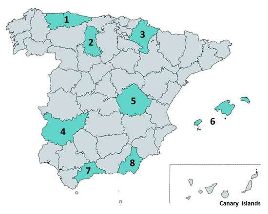 Geographical origin of durum wheat accessions presenting carotenoid esters. Spanish province number: 1. Asturias (BGE045629, BGE047531, BGE048495 and BGE048496); 2. Palencia (BGE047506); 3. Navarra (BGE045645 and BGE047504); 4. Badajoz (BGE047523 and BGE047535); 5. Cuenca (BGE012301 and BGE047524); 6. Islas Baleares (BGE047507 and BGE047536); 7. Málaga (BGE047520); 8. Almería (BGE048494).