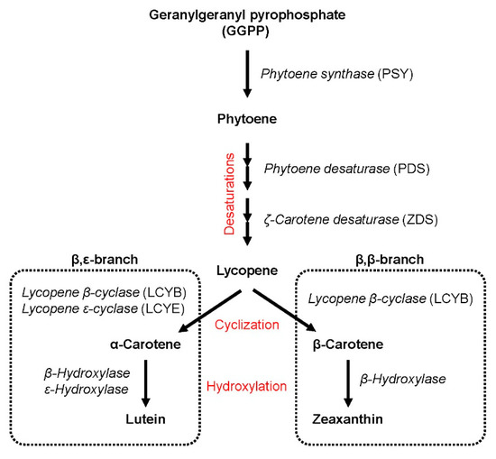 In humans, carotenoids cannot be synthesized and thus, they are considered essential nutrients exerting important functions in health. The consumption of carotenoid-rich foods has also been associated with a lower risk of developing certain types of cancer [2]. In particular, lutein and zeaxanthin have been associated with the alleviation of age macular degeneration [3] and they may play a role in neural system development [4]. Furthermore, vitamin A deficiency is one of the main causes of malnutrition in the world [5]. All carotenoids with unsubstituted β-rings have provitamin A activity, therefore β-carotene is the most potent vitamin A precursor since it has two β-rings [6]. This has promoted the development of biofortification programs towards the enhancement of β-carotene content in rice and maize [7,8,9,10].