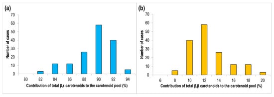 Contribution of β,ε-branch carotenoids (a) and β,β-branch carotenoids (b) to the total carotenoid pool (%) in the Spanish durum wheat collection.