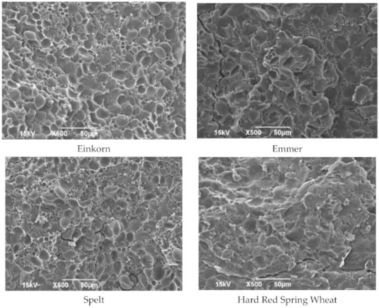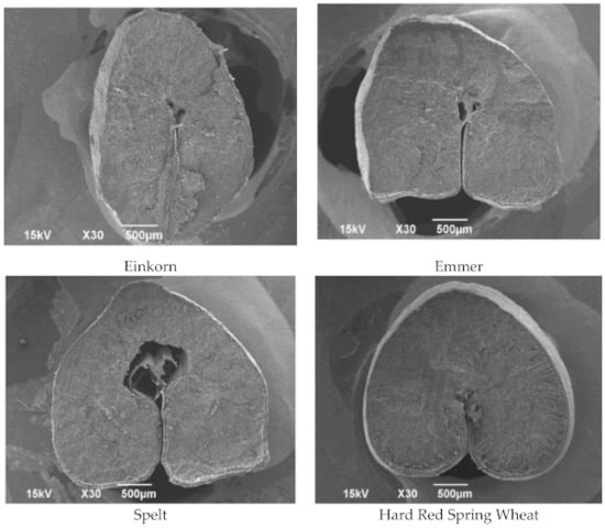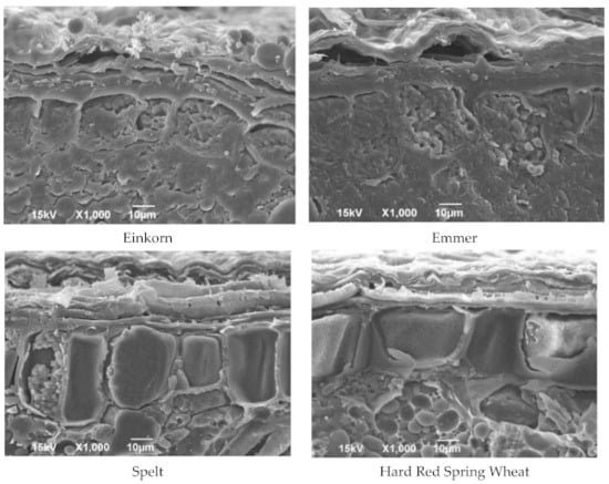 3.2. Microstructure of Hulled Wheat Kernels by Scanning Electron Microscopy (SEM)