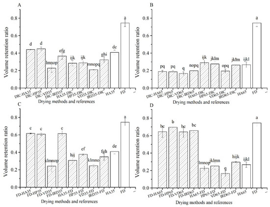 The volume retention ratios of mushrooms are shown in Figure 1. The FD and HA65 references show the highest and the lowest volume retention ratio, 0.75 and 0.27, respectively. Among the combined drying methods, DIC-postdrying65 show the lowest volume retention (0.17–0.20), while FD-postdrying35 and 65, show the highest volume retention (0.60–0.69), excluding FD-VD35, but similar to the FD reference (0.75). It is also striking that all pre-drying treatments show poor volume retention. The DIC-postdrying35 shows overall similar volume retention (0.37–0.45) as the HA35 reference (0.41), except for the vacuum drying step: DIC-VD35.