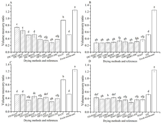 Volume recovery ratio of mushrooms after rehydration with different drying methods (
