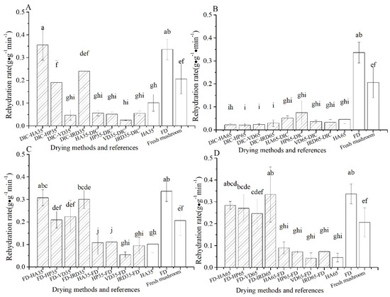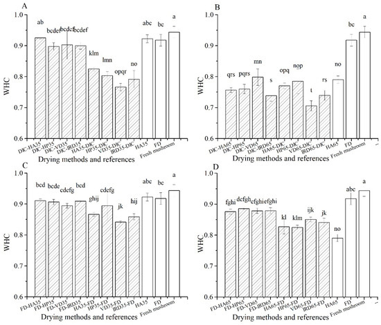 As shown in Figure 5, HA35 and FD treatments have high WHC, similar to that of fresh mushrooms (0.95), but also comparable to several combined drying treatments, namely FD-post-drying and DIC-postdrying35. Poor WHC is shown by DIC-postdrying65 and predrying65-DIC treatments, varying from 0.70–0.79.