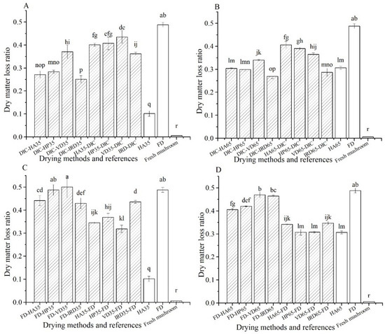 As shown in Figure 4, after rehydration, the dry matter loss of FD samples is the highest, as high as 50% of its total dry matter content. The dry matter loss of HA35 samples is lowest for all dried samples, accounting for 10% of its total dry matter content, while the dry matter loss is negligible for fresh mushrooms. Among combined drying treatments, DIC-postdrying35/65 shows the lowest dry matter loss, but is comparable to HA65, accounting for 31% of its total dry matter content. For FD-post-drying treatments the dry matter loss is similar to FD reference, but it is slightly lower for pre-drying-FD.