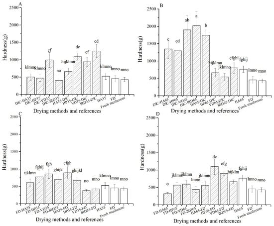 The hardness of the rehydrated mushrooms was measured by a texture analyzer (Stable Micro System Co., Ltd., Surrey, UK). A cylindrical probe (P/36) was used to compress cubical samples (measuring 0.5 × 0.5 × 0.5 cm3). The compression distance on samples was fixed at 50% of their original height. The test speed was 1.5 mm/s. Measurements were performed with 10 repetitions for each sample.