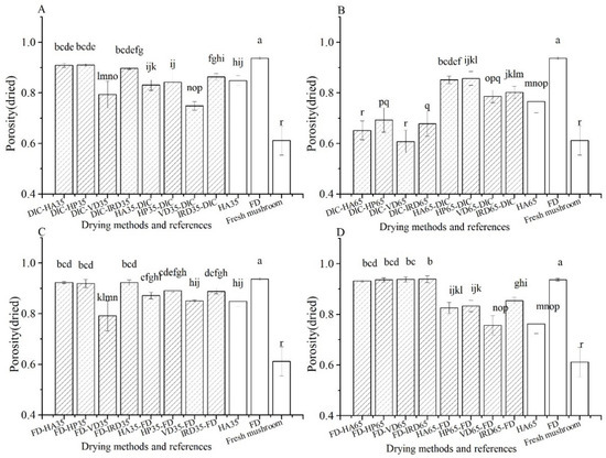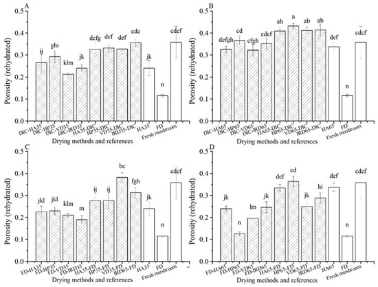 Porosity of rehydrated and fresh mushrooms treated with different drying methods (