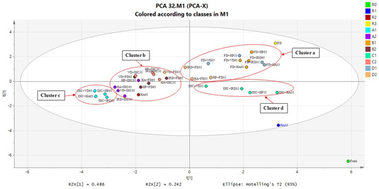 All the measurements were performed at least in triplicate (or more if stated otherwise), and the results were presented in the figures by their averaged values and error bars representing standard errors (computed from standard deviations and 95% confidence intervals). Statistical analysis was carried out using SPSS software (Version 18.0, SPSS, Inc., Chicago, IL, USA). Significant differences among product quality attributes were expressed with small letters a–t in the bar graphs showing the results. This was obtained by one-way analysis of variance (ANOVA), for significance at the p < 0.05 level, and Duncan’s test. Notably, due to the sensory evaluations conducted in four separated trials, ANOVA comparison of the common references from the four trials was conducted to assure no significant difference between them, and hence the sensory scores of the four trials can be compared together. Furthermore, principal component analysis (PCA) involving all indicators was carried out by employing SIMCA software (Version13.0, Umetrics, Umea, Sweden) to identify clustering within the different treatments, and possible correlations between quality parameters.